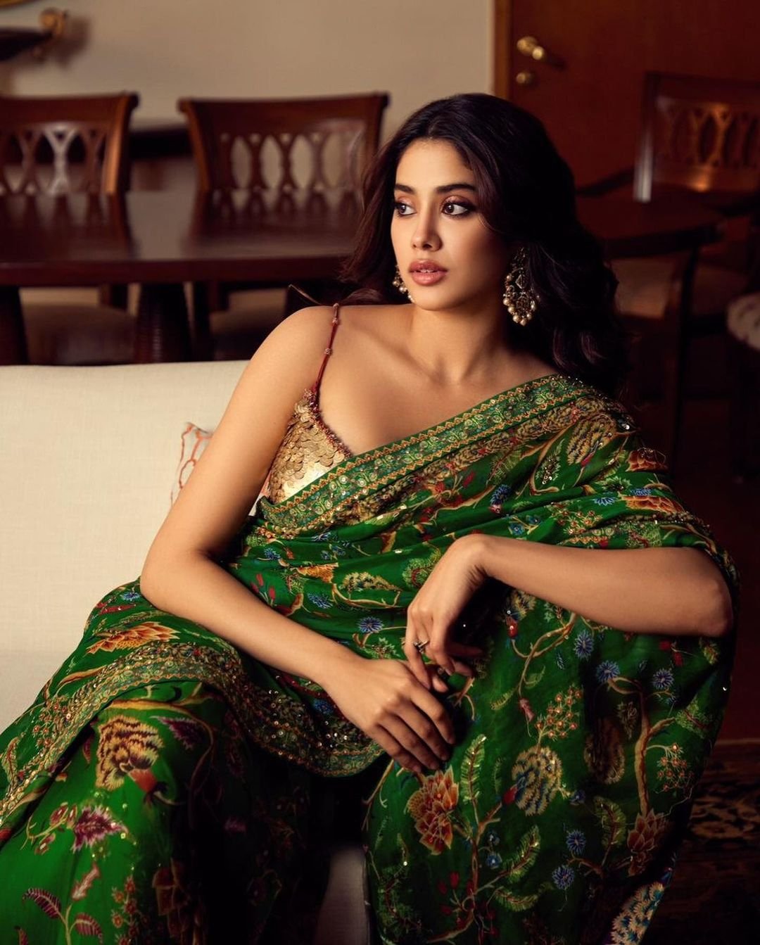जान्हवी ने नीले ब्लाउज के साथ खूबसूरत हरे रंग की चाऊ साड़ी में अपना देसी लुक दिखाया